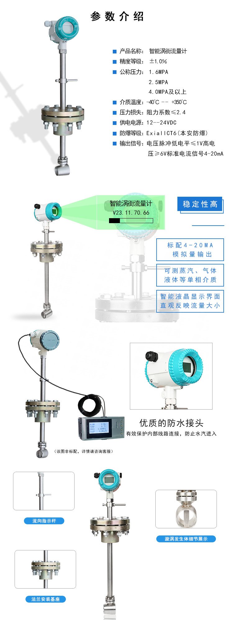 插入式渦街流量計采用壓電應力式傳感器可靠性高可在-20℃~+350℃的工作溫度范圍內工作。